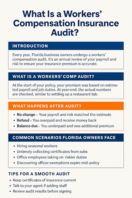 What is a Workers' Comp Insurance audit? - Introduction - Every year, Florida business owners get a notice from their insurance carrier: it’s time for a workers’ comp audit. For many, this is a confusing and stressful...